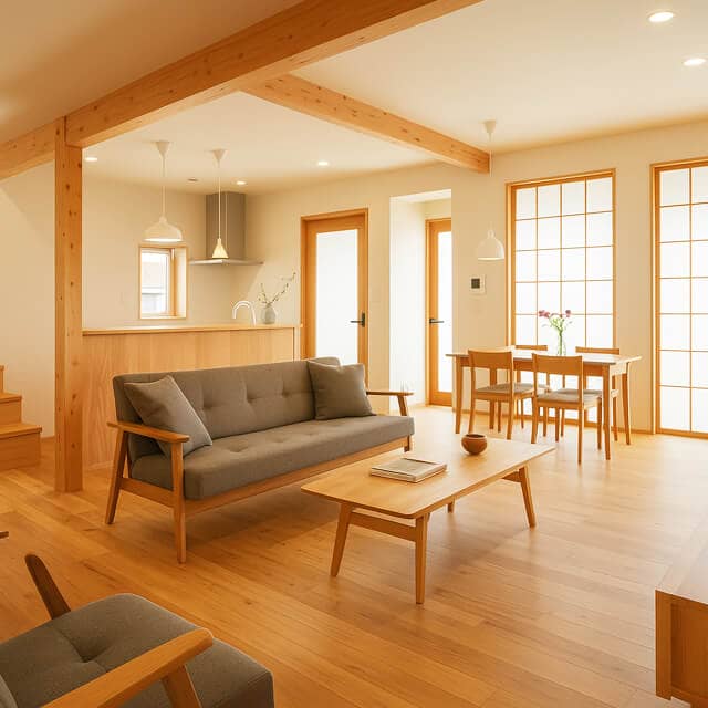 一歩足を踏み入れると、ふわりと木の香りに包まれます。大きな窓から陽光が降り注ぐリビングは、家族みんなのお気に入りの場所。自然と会話が弾み、子どもたちの笑い声が絶えません。無垢材の床の心地よさ、柱や梁の力強さ、すべてに木の温もりを感じます。理想だった「家族が自然と集まる家」を叶えていただき、本当に感謝しています。